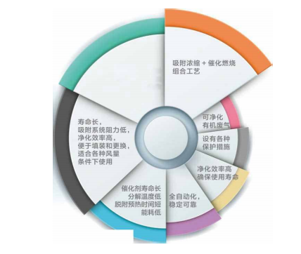 1、采用吸附濃縮 + 催化燃燒組合工藝,整個(gè)系統(tǒng)實(shí)現(xiàn)了有機(jī)物吸附、脫附過 程閉循環(huán)。